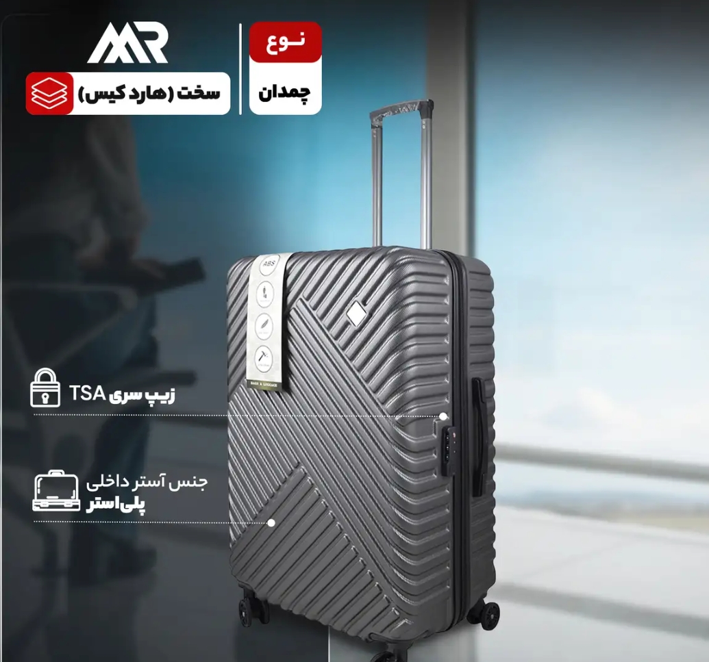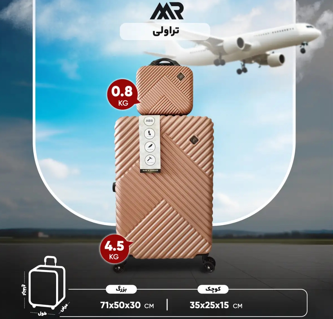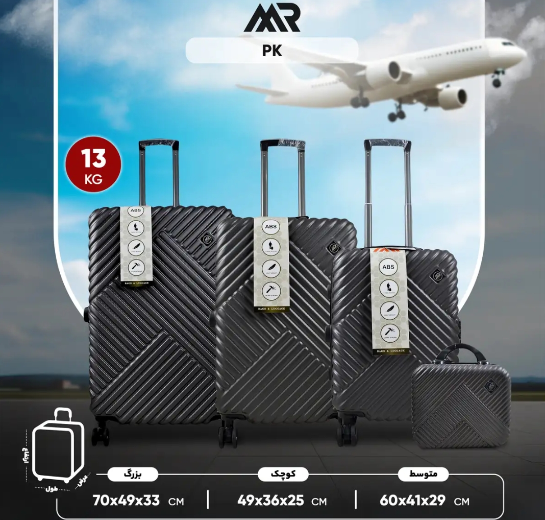 مجموعه چهار عددى چمدان ام آر مدل PK داراى سه جمدان با بدنه ى ABS مقاوم با يك ساك دستى است فضاى داخل اين مدا، داراء، یک جيب براى لباسهاى كثيف و خيس و زيپ تعويض وتعمير مجزاست همچنين طراحى جديد جهت قرار دادن بهتر البسه و وسايل براى اينمدل اجرا شده است و هر سايز چمدان يك كاور جداگانه دارد.